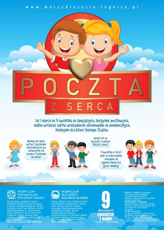 Tradycją jest, iż Legnicki Marsz dla Życia i Rodziny (odbędzie się w Niedzielę Palmową) poprzedzają inicjatywy charytatywne i modlitewne. Tym razem inicjatywa charytatywna ma tytuł „Poczta z Serca” i jest skierowana zarówno do dzieci jak i do dorosłych. Organizatorzy roześlą do wszystkich parafii w diecezji legnickiej oraz do wybranych szkół specjalne skrzynki na listy z zachętą do namalowania lub napisania kartki z życzeniami wielkanocnymi dla podopiecznych z Hospicjum dla Dzieci Dolnego Śląska.