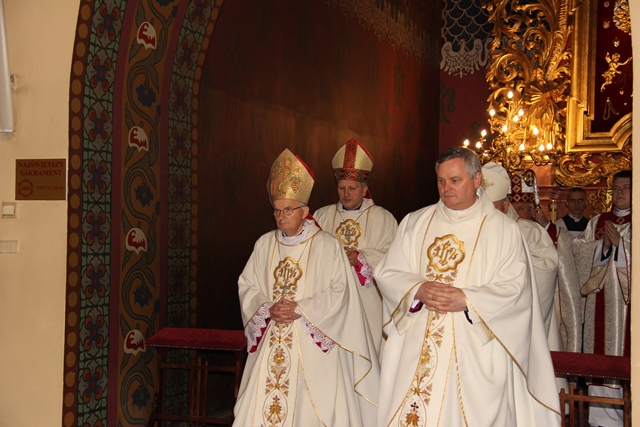 W homilii biskup kaliski zachęcał duchownych do odkrywania na nowo swojego kapłaństwa. – W roku jubileuszowym 25-lecia istnienia diecezji kaliskiej staramy się na nowo odkryć tożsamość kapłańską, aby jeszcze gorliwej pracować w winnicy Pańskiej. Wewnętrzna formacja kapłańska z natury rzeczy nastawiona jest na ciągły rozwój i wzrost – mówił celebrans. Podkreślał, że kapłani poprzez Słowo Boże, sakramenty święte i ewangelizację budują Kościół święty, który jest komunią, a nie organizacją użyteczności publicznej. – Niestety, wielu publicystów wypowiadających się na łamach prasy na temat Kościoła, chciałoby go sprowadzić tylko do jakiejś organizacji charytatywnej lub filantropijnej – powiedział kaznodzieja. Dodał, że akcja charytatywna to tylko jeden z aspektów działalności Kościoła, ważny, ale nie najważniejszy. – Zadaniem Kościoła jest misja zbawienia człowieka i w tę misję musi być wpisane nasze kapłaństwo – stwierdził bp Janiak. Zaznaczył, że współczesny świat jest dotknięty laicyzmem, który eliminuje z życia człowieka obecność Boga, wartości nadprzyrodzone i moralne kryteria oceny postępowania ludzi. – Z drugiej strony mamy do czynienia z fundamentalizmem religijnym, który prześladuje i morduje w imię religii, w imię Boga, co jest niezgodne z elementarnym poczuciem zdrowej religijności. W tę optykę współczesnej cywilizacji i globalizacji wrzucony jest kapłan, aby mimo wszystkich przeszkód głosił Dobrą Nowinę o zbawieniu – wskazywał hierarcha. Prosił wiernych o modlitwę w intencji księży. – Zwracam się do Was, drodzy wierni, abyście swoją modlitwą wspierali swoich duszpasterzy. Przez dobrą i harmonijną współpracę można dokonać wiele szlachetnych dzieł w parafiach, do których należycie. Niech Wasza dyspozycyjność będzie zachętą dla kapłanów, by jeszcze gorliwiej pracowali dla zbawienia dusz – mówił ordynariusz kaliski. Podziękował księżom za posługę w diecezji kaliskiej. – Chciałbym Wam serdecznie podziękować za Waszą pracę dla dobra Kościoła Kaliskiego. Ten Kościół jest Waszą matką, a matkę trzeba kochać i wiernie jej służyć – powiedział bp Janiak. W czasie uroczystej liturgii biskup kaliski poświęcił krzyżmo oraz oleje chorych i katechumenów.
