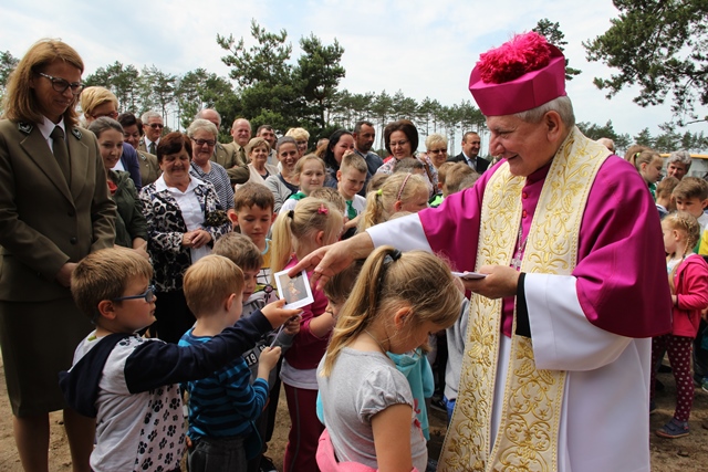 Biskup kaliski dziękował leśniczemu za inicjatywę wybudowania kapliczki. – To jest piękny symbol wdzięczności wobec Pana Boga, ale też piękny przykład dla młodego pokolenia. Kościół Kaliski jest młody w swoich strukturach, bo ma dopiero 25 lat. Niedawno dziękowaliśmy Panu Bogu za 20. rocznicę pobytu Jana Pawła II w Kaliszu. To zapisało się mocno w naszej pamięci. Mam też osobiste wspomnienia związane z wizytą papieża w Kaliszu. Pamiętam ten ogromny tłum i to ujmujące przemówienie Ojca Świętego w trosce o rodzinę i dzieci. Takich przeżyć nie zapomina się. W ten jubileuszowy czas wpisuje się ta dzisiejsza uroczystość wdzięczności człowieka wobec Boga – mówił bp Janiak.