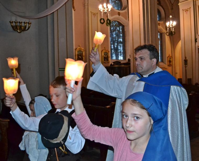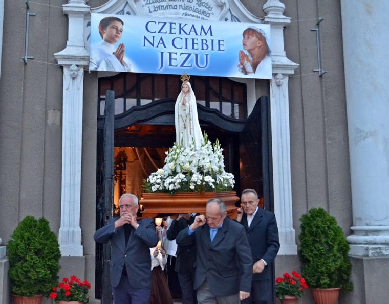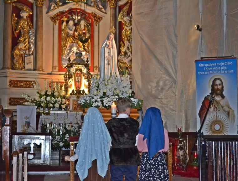 W rozważaniu poprzedzającym modlitwę różańcową ks. kan. Krzysztof przybliżył parafianom stan serc fatimskich pastuszków. Podkreślił, że byli oni posłuszni swoim rodzicom, pełni prostoty i czystości. Jak wskazał, to zapewne było powodem tego, że to właśnie im Maryja powierzyła misje zaniesienia światu swego przesłania. W dalszej części rozważania ks. kanonik przypomniał uczestnikom modlitewnego spotkania treść drugiego objawienia. Zaakcentował rolę i znaczenie ustanowienia nabożeństwa do Niepokalanego Serca Maryi. Podkreślając znaczenie wspólnoty i pracy nad sobą powiedział m.in. „ Nasza parafialna wspólnota ma również swoje serce. Ono bije w każdym z nas. Wciąż uczymy się jaką powinniśmy być wspólnotą. Zadania te wynikają z naszego chrztu. Ponieważ jednak nasza ludzka natura skłonna jest do grzechu, dlatego wciąż modlimy się , pracujemy nad sobą, aby nasze serca były podobne do Serca Pana Jezusa i Niepokalanego Serca Maryi”. Ks. kan. podkreślił, że w wielu miejscach, gdzie miały miejsce objawienia Matki Bożej gromadzą się tłumy wiernych, którzy chcą dotknąć tajemnicy Niepokalanego Serca Maryi. Kończąc rozważanie ks. kan. powiedział: „ My zgromadzeni na nabożeństwie fatimskim odmawiamy różaniec, śpiewamy pieśni maryjne, prosimy Maryję o wstawiennictwo u Trójjedynego Boga we wszystkich naszych potrzebach. Tym samym jesteśmy wspólnotą , której celem jest sam Bóg”. Po zakończeniu rozważania rozpoczęliśmy modlitwę różańcową. Przy pięknie przyozdobionej figurze Pani Fatimskiej nie mogło zabraknąć pastuszków. W ich postacie wcieliły się dzieci z naszej parafii. Ku niebu popłynęła modlitwa, o którą nieustannie prosiła i prosi Maryja… W kontemplowaniu tajemnic różańca pomocne były rozważania ks. kanonika. Przed rozpoczęciem czwartej tajemnicy ks. kan. od świecy płonącej przy figurze odpalił świece pastuszków. Ci zanieśli to światło do uczestników nabożeństwa. Po zakończonej modlitwie różańcowej wyruszyliśmy w procesji z figurą Fatimskiej Pani zapalonymi świecami wokoło kościoła. Podczas procesji rozległo się bicie dzwonów w mikstackiej świątyni. Wzywają nas one i przypominają codziennie od dnia nawiedzenia o Apelu Jasnogórskim. Gdy procesja powróciła do kościoła w duchowej łączności z Jasną Górą śpiewaliśmy: Maryjo jestem, pamiętam, czuwam! Po końcowym błogosławieństwie wierni otoczyli figurę Fatimskiej Pani i zaśpiewali pieśń „ Zapada zmrok…”. Wypowiedziane z życzliwością i uśmiechem słowa „ Dobrze, że jesteś” do osób stojących najbliżej nas uświadomiły nam, że naprawdę jesteśmy wspólnotą. I jeszcze jedna refleksja. Pięknie prezentowała się udekorowana kwiatami Fatimska Pani, ale co najważniejsze otoczona była sercami kochających Ją ludzi.