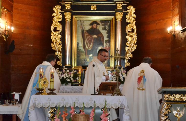O godz. 18:30 ks. kan. Bogumił Kempa, ks. kan. Krzysztof Ordziniak, ks. Krzysztof Lipiński sprawowali w sanktuarium Eucharystię połączoną z Nowenną. Zgromadzeni wierni mogli wysłuchać piątej już nauki rekolekcyjnej, która wygłosił ks. kan. Bogumił. Na początku kaznodzieja zwrócił naszą uwagą na fakt, że w tym nowennowym czasie Kościół wspomina każdego dnia postacie Świętych. Podkreślił, że są to postacie, które patrząc po ludzku nie dokonały niczego nadzwyczajnego, ale zostały wybrane przez Pana Boga. Jak podkreślił kaznodzieja, były to osoby żyjące Ewangelią, które nie bały się wziąć krzyża, nie bały się zaprzeć samych siebie. Zwrócił uwagę, że człowiekowi wydaje się, że wiara ma nam zagwarantować nam życie łatwe, miłe, przyjemne. Jezus nigdy nam takiego życia nie obiecywał. Taka postawa wobec wiary, wobec Boga może prowadzić do jej utraty, odrzucenia w chwilach trudnych doświadczeń. O powołaniu do świętości mówił dalej ks. kan. Bogumił: „ Świętość osiąga się wtedy kiedy bierze się krzyż. Jezus nigdy nie mówił, że świętym zostanie człowiek, którego życie będzie miłe, łatwe, przyjemne, który będzie codziennie doświadczał Bożego błogosławieństwa- Jeśli kto chce iść za mną, niech się zaprze samego siebie, niech weźmie swój krzyż i niech Mnie naśladuje. Wybranie przez Chrystusa zawsze łączy się z krzyżem. Kaznodzieja przybliżył postać św. Klary, akcentując, że dla niej, podobnie jak i dla św. Rocha Chrystus był kimś autentycznym, kimś dla kogo zaparli się samych siebie, dla kogo brali swój krzyż.