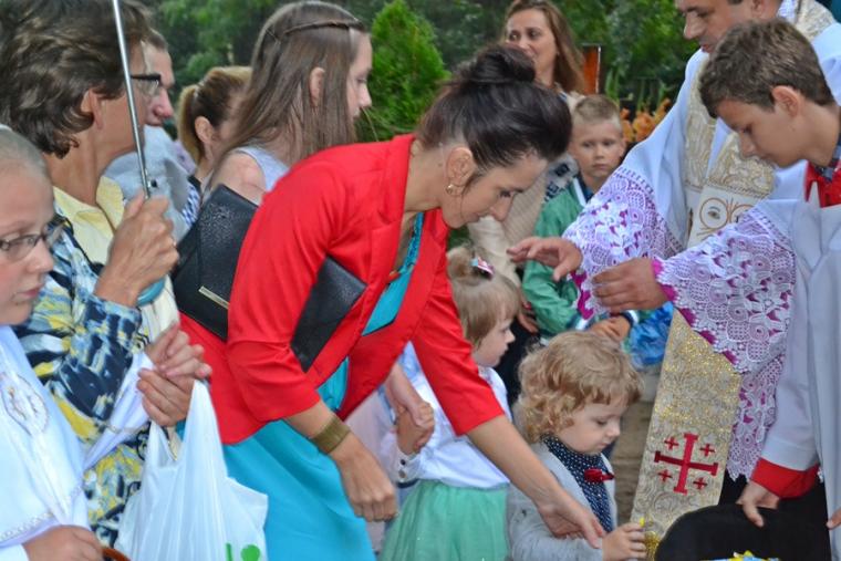 Czas wielkiego świętowania rozpoczął się procesją z Najświętszym Sakramentem i relikwiami Świętego Rocha z kościoła farnego do sanktuarium, zakończył jej powrotem. Zanim procesja z Najświętszym Sakramentem wyruszyła z sanktuarium do fary wyjątkowo gwarno zrobiło się wokół niego. W dniu uroczystości odpustowych przybyły wraz ze swoimi rodzicami do św. Rocha dzieci. Tu o godz. 18:00 ks. kan. Bogumił Kempa sprawował w ich intencji Mszę święta oraz skierował do wiernych rozważanie. Krótko po rozpoczęciu Eucharystii zaczął padać deszcz. Ksiądz Bogumił zaprosił dzieci, by zgromadziły się przy ołtarzu, bo zostało nad nim przygotowane zadaszenie. Na początku homilii kaznodzieja powiedział, że pierwszy raz głosi ją w takim towarzystwie. Wyraził radość z obecności tak wielu dzieci w sanktuarium u św. Rocha. Podkreślił, że dzieci przybyły tu po błogosławieństwo, które czyni człowieka szczęśliwym. Wyjaśniając istotę błogosławieństwa powiedział: „ Jeżeli błogosławię, to znaczy życzę komuś dobrze, życzę mu szczęścia. Przyszły tutaj te dzieci, aby mogły dostać Boże szczęście, dlatego tak ważna drodzy rodzice jest wasza obecność tutaj”. O tym jak ważne jest to, by rodzice błogosławili swoje dzieci mówił kaznodzieja w dalszej części rozważania. Zachęcał, by rodzice jak najczęściej błogosławili swoje dzieci. Dając świadectwo powiedział, że jego rodzice nadal błogosławią go, gdy wraca do domu, bądź z niego wyjeżdża. Stwierdził, że ważne jest to błogosławieństwo, bo uświadamia nam, że tylko Chrystus może dać nam prawdziwe szczęście. Nawiązując do postaci św. Rocha powiedział: „ Ten nasz wspaniały Patron, którego czcimy już od tylu dni jest tego dowodem. Ten człowiek doświadczył i cierpienia i złośliwości, doświadczył uwięzienia, doświadczył choroby. Doświadczył tego, że tak wielu ludzi się od niego odwróciło. A jednak jest błogosławiony, jest szczęśliwy”. W dalszej części rozważania ks. Bogumił zachęcał i prosił rodziców,aby uczestniczyli z dziećmi we Mszy św. i pokazywali im jak jest ona ważna. Podkreślił ponadto znaczenie przykładu rodziców i zachęcał, by klękali do modlitwy i uczyli jej swoje dzieci. Kończąc homilię kaznodzieja powiedział: „ Niech Boże błogosławieństwo z tego miejsca, z tego sanktuarium spływa na was, na wasze rodziny, na wszystkie dzieci, także na te nienarodzone, bo widzę że i takie też tu są. Niech Pan Bóg wam wszystkim błogosławi”. Została odmówiona specjalna modlitwa, a następnie kapłani udzielali dzieciom indywidualnego błogosławieństwa. Na pamiątkę spotkania u św. Rocha dzieci otrzymały obrazki. Były też i dla nich słodycze.