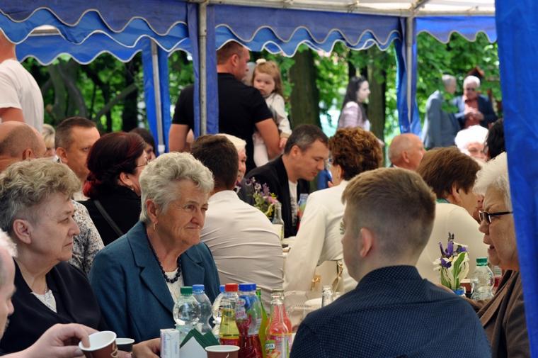 Po dziękczynieniu Panu Bogu nadszedł czas na radosne spotkanie w Parku Świętego Rocha. Dlaczego tam? Wielkim pragnieniem księdza Jubilata było spotkanie się przy stole ze wszystkimi uczestnikami dziękczynnej Eucharystii. Żadna sala nie byłaby w stanie pomieścić wszystkich tych, którzy w tym wyjątkowym dniu ofiarowali ks. Jubilatowi najcenniejszy dar – modlitwę.