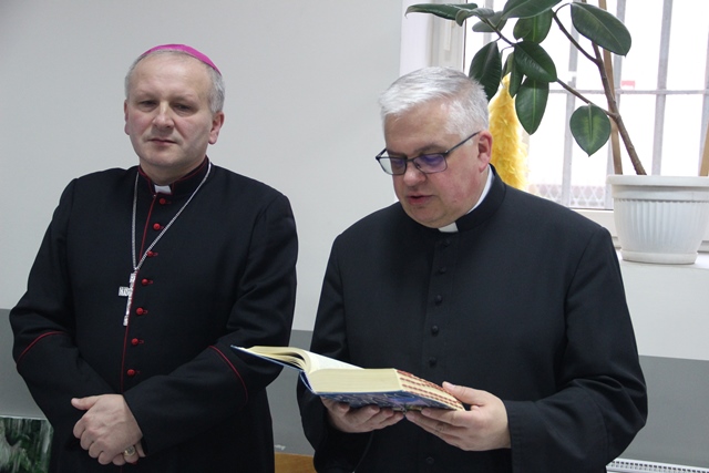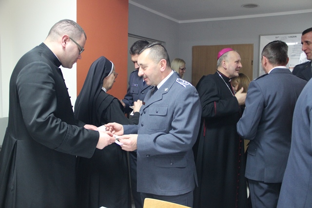 Wizytę w Areszcie Śledczym rozpoczęło spotkanie z pracownikami. Gości powitał dyrektor kpt. Waldemar Zaremba. Po odczytaniu Ewangelii o Bożym Narodzeniu przez ks. kan. Krzysztofa Nojmana, proboszcza konkatedry, słowo do pracowników aresztu skierował bp Łukasz Buzun, który przypomniał, że 6 stycznia kończy się obchodzony w diecezji kaliskiej Nadzwyczajny Rok Świętego Józefa Kaliskiego. - Chciałbym, aby św. Józef, który jest patronem diecezji był opiekunem tego miejsca i każdego z was. Św. Józef to człowiek szczery, prosty, otwarty, zdecydowany w swoim działaniu, słuchający głosu Bożego. Życzę, aby te święta wnosiły dużo pokoju w serca i by ten dobry klimat świąteczny był przekazywany w środowisku pracy – mówił duchowny.