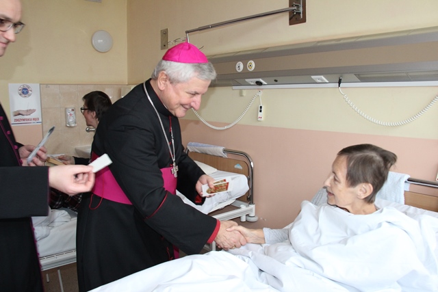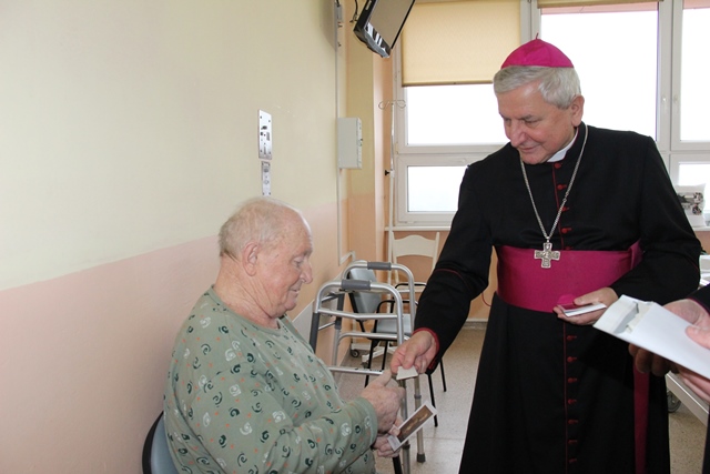 Biskup odwiedził pacjentów oddziału chirurgii ogólnej i przewodu pokarmowego, a pozostali kapłani przełamali się opłatkiem z chorymi leżącymi na wszystkich oddziałach kaliskiego szpitala.