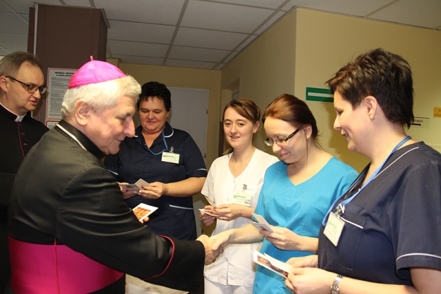 W słowie skierowanym do pracowników szpitala bp Edward Janiak dziękował za troskę o pacjentów. – Nieraz nie zdajemy sobie sprawy, jak ważna jest rola pielęgniarki, która uśmiechnie się do pacjenta. Ogromnie ważne jest to, aby dawać drugiemu człowiekowi nadzieję. Proszę przyjąć serdeczne podziękowanie za tę służbę, która jest często niedostrzegana. Rzadko kto dziękuje za trud nieprzespanej nocy, dyżury, poświęcenie – mówił biskup kaliski.