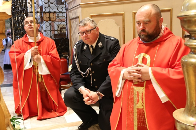 Wraz z biskupem kaliskim Edwardem Janiakiem modlili się: ks. prał. Jacek Plota, kustosz Narodowego Sanktuarium św. Józefa, ks. kan. Paweł Jabłoński, kapelan strażaków powiatu kaliskiego, ks. kan. Piotr Kuświk, kapelan strażaków powiatu ostrowskiego i ks. kan. Krzysztof Duchnowski, kapelan biskupa.