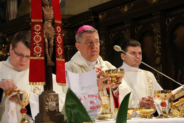 Polecał polskie rodziny św. Józefowi. - Józefie sprawiedliwy, Opiekunie Zbawiciela czuwaj nad naszymi rodzinami, nad każdym życiem, ucz nas zgody i solidarności, pomagaj zachować tożsamość katolicką i narodową oraz budować pokój, braterstwo z innymi narodami na fundamencie prawdy i miłości ewangelicznej. Bądź stróżem naszej ojczyzny i wraz Maryją wypraszaj nam błogosławieństwo Jezusa Zmartwychwstałego – powiedział bp Leszczyński.