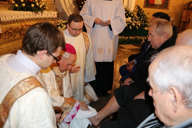 Podczas liturgii Wielkiego Czwartku bp Stanisław Napierała obmył nogi dwunastu mężczyznom – przedstawicielom parafian katedry św. Mikołaja w Kaliszu.