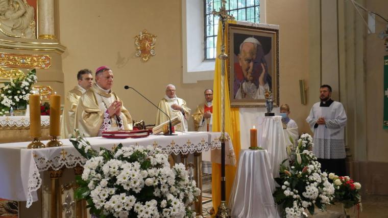 13 czerwca odbyła się w Mikstacie uroczystość przekazania przez Abpa Mieczysława Mokrzyckiego, wieloletniego osobistego sekretarza dwóch papieży, relikwii św. Jana Pawła II. Przekazując relikwie ks. proboszczowi Krzysztofowi Ordziniakowi ks. Abp powiedział: „Księże proboszczu, przyjmij tę relikwię i otaczaj ją należytą czcią i przekazuj do czczenia wiernym. Niech wszyscy modlący się przed tymi relikwiami za wstawiennictwem św. Jana Pawła II otrzymują obfitość łask i niech Go naśladują w wierze i miłości”. Następnie słowa powitania zostały wypowiedziane przez przedstawicieli parafian. Ks. proboszcz przypomniał inicjatywy podjęte w parafii, które doprowadziły do tej radosnej chwili przekazania relikwii. Podkreślił, że w znaku relikwii chcemy uczcić i powitać św. Jana Pawła II jako opiekuna i orędownika, ale także pogłębić więź modlitewną, przekazać dziedzictwo, które nam pozostawił kolejnym pokoleniom. Zwracając się do Ks. Abp Mieczysława Mokrzyckiego ks. proboszcz zaakcentował, że przybywa z dalekiego Lwowa, aby przekazać nam relikwie św. Jana Pawła II oraz wzmocnić naszą wiarę świadectwem swego życia. Następnie ks. kan. Krzysztof skierował słowa powitania do wszystkich uczestników uroczystości, dziękując tym, którzy przyczynili się do tego, że mogła się ona odbyć. Ks. proboszcz poprosił Hierarchę o przewodniczenie Eucharystii i sprawowanie jej w intencji wszystkich parafian.