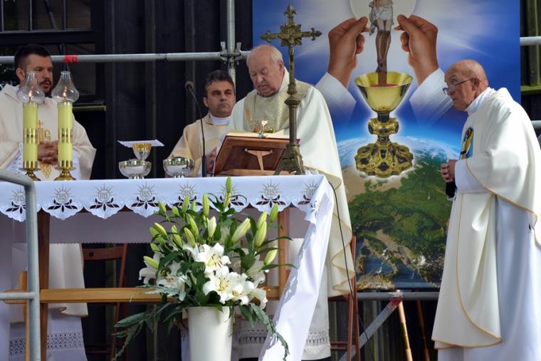 Msza Święta koncelebrowana rozpoczęła się przy ołtarzu polowym przy sanktuarium o godz. 18:30. Przewodniczył jej ks. proboszcz Krzysztof Ordziniak. Wraz z nim przy ołtarzu stanęli ks. kan. Andrzej Grabański, ks. kan. Grzegorz Ignor i ks. wikariusz Marcin Walczak. Rozpoczynając Eucharystię ks. kan. Krzysztof zaznaczył, że w Najświętszej Eucharystii zawiera się całe dobro duchowe Kościoła. Sprawia to, że człowiek wierzący pragnie spotykać się ze swoim Panem. Zaakcentował, że dobrze, że tradycją jest, że zakończenie oktawy Bożego Ciała odbywa się przy sanktuarium św. Rocha, wśród grobów naszych bliskich. Mamy okazję wyrazić im wdzięczność modlitewną za przekazany dar wiary. Jednocześnie zachęcał zebranych na Mikstackim Wzgórzu, by postawili sobie pytanie: Co ja przekazuję następnemu pokoleniu?