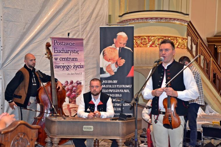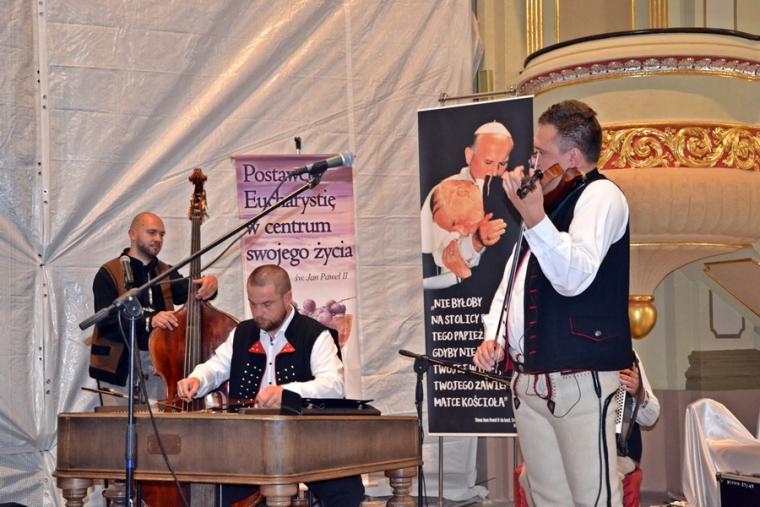 W niedzielne przedpołudnie mieliśmy okazję uczestniczyć w jednym z nich zatytułowanym „ Nuty góralskie o św. Janie Pawle II”. Poprzedziła go Eucharystia, którą w sposób aktywny włączyli się członkowie Kapeli „Góralska Hora”. Mieliśmy okazję wysłuchać czytań, które tym razem wybrzmiały w naszym kościele w gwarze góralskiej. Odśpiewany psalm, był próbką uczty duchowej, która czekała nas po Eucharystii. Także podczas Przeistoczenia, tym razem, nie rozległ się głos dzwonków, ale rogu pasterskiego.