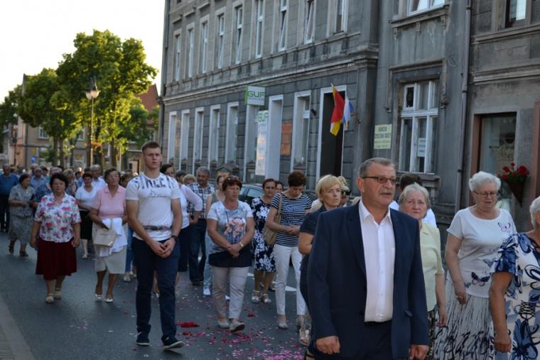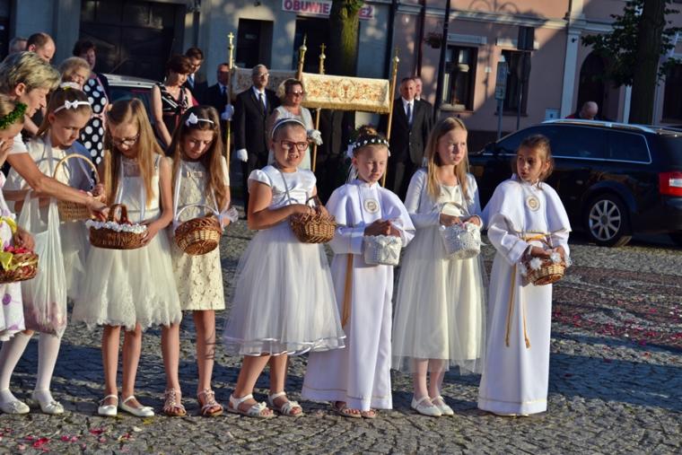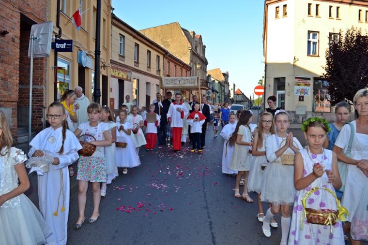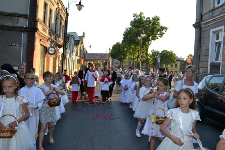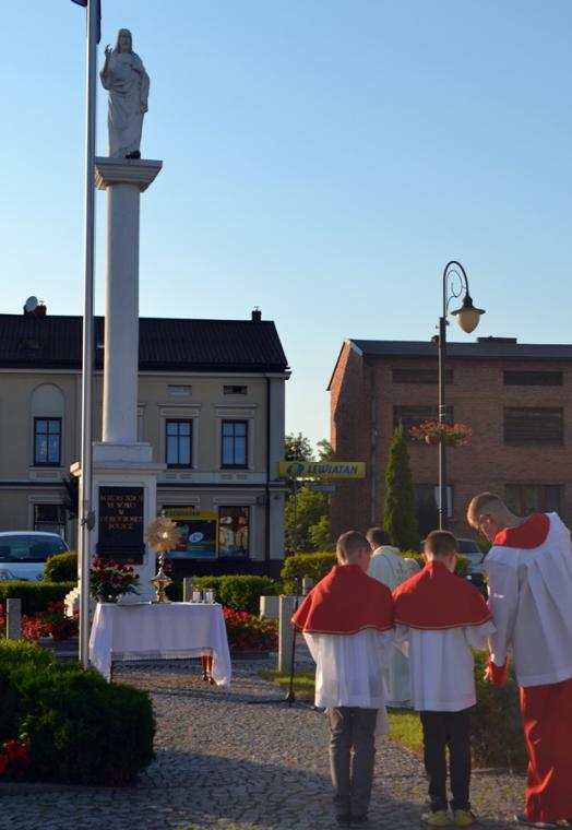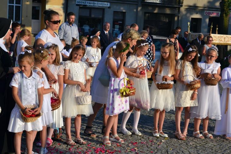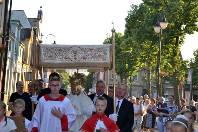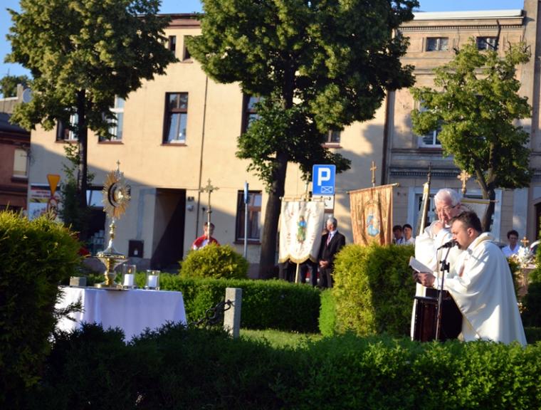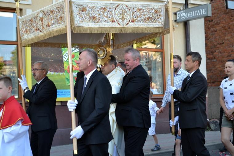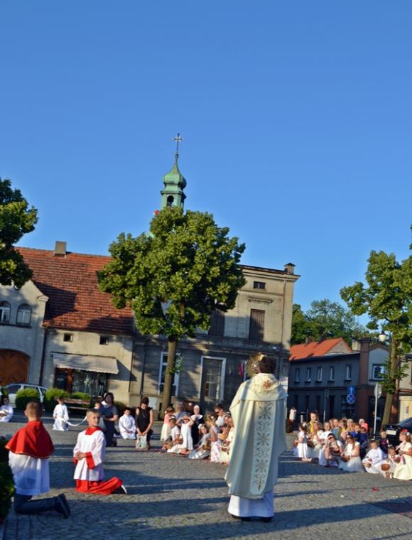 Mikstat: Eucharystią w kościele farnym, a następnie procesją z Najświętszym Sakramentem na rynek uczcili mikstaccy parafianie Najświętsze Serce Pana Jezusa.