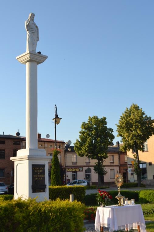 Po Mszy Świętej procesja z Najświętszym Sakramentem wyruszyła na rynek. Znajduje się tam figura Najświętszego Serca Pana Jezusa ufundowana przez mieszkańców. Została poświęcona 12. lipca 1936 roku Ks. Bpa Dymka. W czasie uroczystości poświęcenia ówczesny Burmistrz miasta Pan Franciszek  Toboła odczytał akt poświęcenia się miasta Najświętszemu Sercu Pana Jezusa. 8. czerwca A.D. 2018 roku słowa aktu wybrzmiały ponownie. Odczytał je tym razem pełniący obecnie obowiązki Burmistrza Miasta i Gminy Mikstat pan Henryk Zieliński. Obecni na mikstackim rynku usłyszeli m.in. takie słowa: „Przychodzimy więc dzisiaj, by uznać całkowite panowanie Twoje nad miastem naszem. Chcemy odtąd Twojem życiem żyć, chcemy w sobie te cnoty pielęgnować, za które już tu na ziemi pokój obiecałeś(...). Panuj więc nad naszym rozumem przez prostotę wiary, panuj też przez swą miłość nad sercami naszemi, które niech całkowicie nią zapłoną. Chcemy je w Twej żarliwej miłości utrzymać przez częste przyjmowanie Komunii św. Racz, Boskie Serce, przewodzić naszym zebraniom, błogosław nasze duchowne i doczesne przedsięwzięcia, rozpraszaj nasze troski, uświęcaj nasze pociechy i łagódź nasze cierpienia". Jak aktualne pozostają nadal słowa wypowiedziane przed ponad osiemdziesięciu laty. Po odczytaniu aktu poświęcenia się miasta Najświętszemu Sercu Pana Jezusa wybrzmiały słowa pieśni: „Najświętsze Serce Boże, poświęcamy Ci Naszą Ojczyznę i nasze miasto, Nasze rodziny i nas samych; Serce Boże, przyjdź Królestwo Twoje”. W kontekście odnowionego aktu nabrały one wyjątkowego znaczenia. Następnie przy ustawionym nieopodal figury Najświętszym Sakramencie została odmówiona Litania do Najświętszego Serca Jezusowego. Następnie Ks. Kan. Krzysztof  udzielił błogosławieństwa Najświętszym Sakramentem na cztery strony świata. Potem procesja powróciła do kościoła. Udział w uroczystościach ku czci Najświętszego Serca Pana Jezusa był publicznym wyznaniem wiary, świadectwem, dla tych, którzy nie dostrzegają jeszcze być może, bądź nie odkryli bogactwa miłości i wielości łask spływających na ludzkość z przebitego Serca Pana Jezusa.