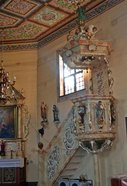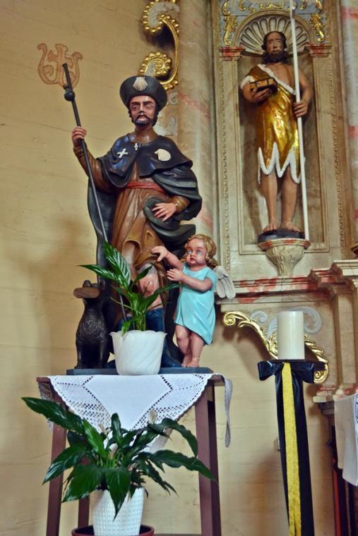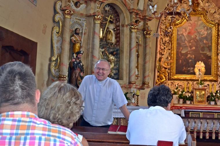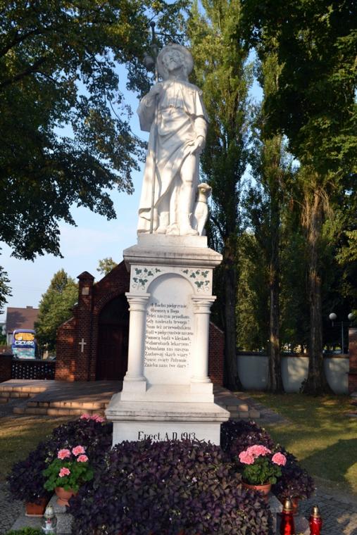 Pierwszym miejscem, które nawiedziliśmy w upalny sobotni dzień był położony na wzgórzu kościół pw. Świętego Rocha w Dobrzeniu Wielkim. To miejsce dla nas szczególne. Podobnie jak w Mikstacie znajduje się tu zabytkowy drewniany kościół pw. Świętego Rocha. W Dobrzeniu, podobnie jak w naszej parafii wierni czczą św. Rocha. Przy kościele oczekiwał na nas ks. proboszcz Jan Polok. Ks. Jan jest także wielkim czcicielem św. Rocha i autorem książki dla dzieci pt. Święty Roch pielgrzym miłości. W kościele był czas na chwilę modlitwy, a następnie ks. Jan przekazał nam kilka ciekawostek związanych z budową tej pięknej świątyni. Opowiedział nam o wystroju kościoła zwracając szczególną uwagę na obraz w ołtarzu głównym przedstawiający św. Rocha orędującego u Boga za chorymi. Z zainteresowaniem wysłuchaliśmy informacji o przebiegu uroczystości odpustowych w Dobrzeniu. Zachwycił wielu ten niewielki, ale niezwykle urokliwy kościół. Po wysłuchaniu informacji ks. Jana odmówiliśmy Litanie do Świętego Rocha. Przed świątynią znajduje się figura św. Rocha w stroju pielgrzyma. Pielgrzym to ktoś znajdujący się w drodze. My także pielgrzymowaliśmy. Było nam dobrze u św. Rocha w Dobrzeniu. Niestety, trzeba było wyruszać dalszą drogę.