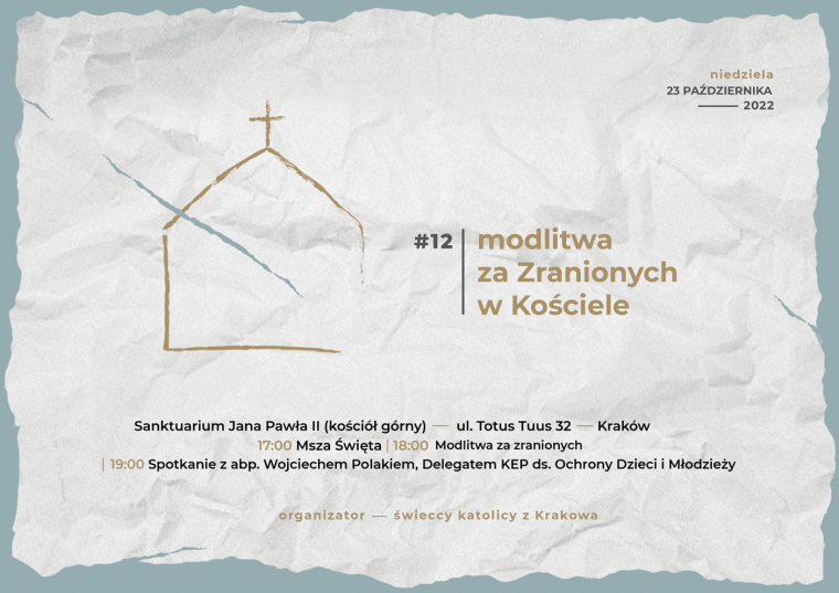 - W niedzielę 23 października 2022 r. spotkamy się w Sanktuarium św. Jana Pawła II, by modlić się wspólnie za osoby, które doświadczyły wykorzystania seksualnego przez duchownych Kościoła Katolickiego. Wydarzenie rozpoczniemy od mszy świętej w intencji osób skrzywdzonych, która zostanie odprawiona o godzinie 17.00 w kościele górnym Sanktuarium - informują organizatorzy. - Wspólna modlitwa w intencji osób Zranionych, w której uczestniczył będzie Prymas Polski abp Wojciech Polak, rozpocznie się o godzinie 18.00 w tym samym miejscu. Po modlitwie zapraszamy do sali "Białej" na spotkanie przy kawie oraz z naszym gościem abp. Wojciechem Polakiem - delegatem Konferencji Episkopatu Polski ds. Ochrony Małoletnich. Spotkanie będzie miało formę pytań i odpowiedzi, podczas którego każdy będzie mógł zabrać głos - zapewniają.
