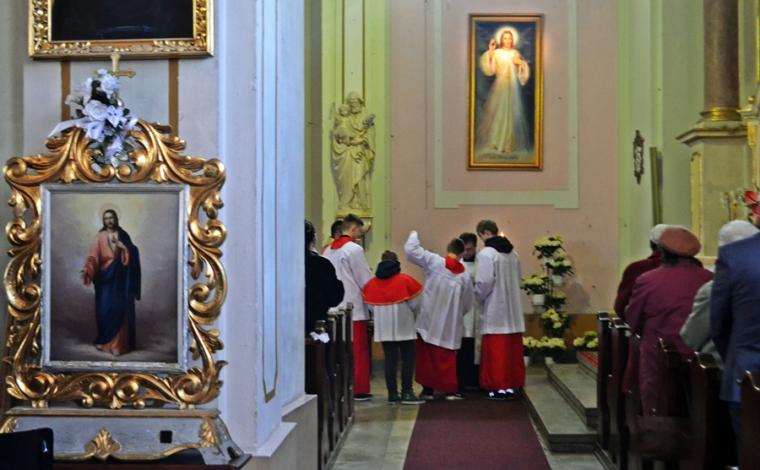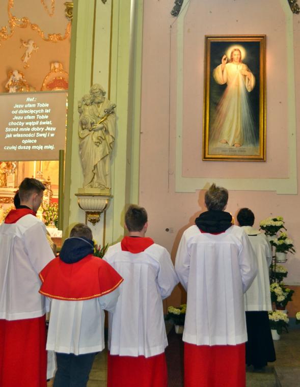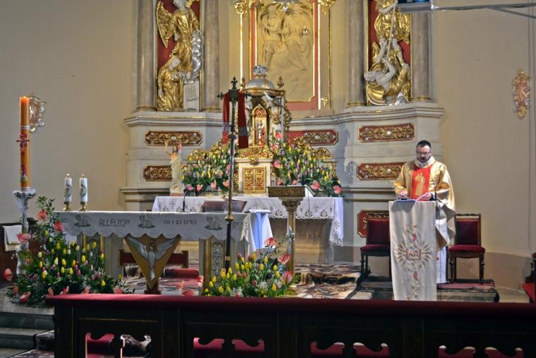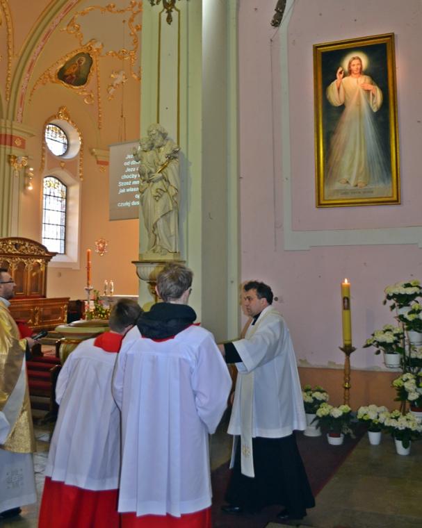 Przygotowani duchowo wkroczyliśmy w Niedzielę Miłosierdzia. Jest już tradycją, że w tym dniu sprawowana jest Eucharystia o wszelkie łaski potrzebne dla czcicieli Bożego Miłosierdzia z Mikstatu i Komorowa. O godz. 9:30 Msze św. w tej właśnie intencji sprawował ks. wikariusz Krzysztof Lipiński. Przed rozpoczęciem Eucharystii ks. kan. Krzysztof Ordziniak poświęcił obraz Jezusa Miłosiernego, który został ofiarowany do naszego kościoła przez p. Adama Joksa i jego małżonkę z dziećmi. Niedziela Miłosierdzia jest dniem szczególnych łask. Przepełnieni wiarą w potrzebę doświadczania Bożego Miłosierdzia przez nas samych, ale także bliskich, którzy poprzedzili nas w drodze do Pana, zebraliśmy się w tym szczególnym dniu, o godz. 15:00 w Diecezjalnym Sanktuarium Świętego Rocha na Koronce do Miłosierdzia Bożego, by polecać w niej bliskich zmarłych. Modlitwie przewodniczył ks. kan. Krzysztof Ordziniak. Po Koronce do Miłosierdzia Bożego odprawiane zostało nabożeństwo Drogi Światła. Mieliśmy okazję przeżyć 14 spotkań ze Zmartwychwstałym Panem. Na ołtarzu została ustawiona figura Chrystusa Zmartwychwstałego i czternaście lampek, które kolejno odpalane były od paschału. Towarzyszył temu śpiew „ My jesteśmy na ziemi…”. Ks. kan. Krzysztof odczytywał rozważanie poszczególnych spotkań z Jezusem zmartwychwstałym. Zapewne skłoniły one wielu do refleksji na jakim etapie drogi jestem? Którego spotkania ze Zmartwychwstałym Panem potrzebuję obecnie? Czy może zatrzymałem(am) się przy pustym grobie? A może tak jak Maria Magdalena szukam Pana? Warto dodać, że w zwieńczeniu ołtarza głównego znajduje się jej obraz. A może jak uczniowie z Emaus na swojej życiowej drodze nie dostrzegamy Jezusa? A może jak Tomasz potrzebujemy, by Pan umocnił naszą wiarę? Po nabożeństwie Drogi Światła w sanktuarium ks. kan. sprawował Mszę w intencji czcicieli Miłosierdzia Bożego z Mikstatu i Komorowa. Kiedyś ks. kan. odpowiedział na wezwanie Pana „ Pójdź za Mną” - tak. Dziś w Jego kapłańskich dłoniach chleb przemienił się w Ciało Chrystusa. Być może tak jak uczniowie poznaliśmy i doświadczyliśmy właśnie wtedy obecności Zmartwychwstałego. Niedziela Miłosierdzia rozpoczyna 74. Tydzień Miłosierdzia. Sami doświadczamy miłosierdzia od Boga, zwłaszcza w Sakramencie Pokuty i Pojednania. Czy to doświadczenie pomoże nam się otworzyć na potrzeby innych?