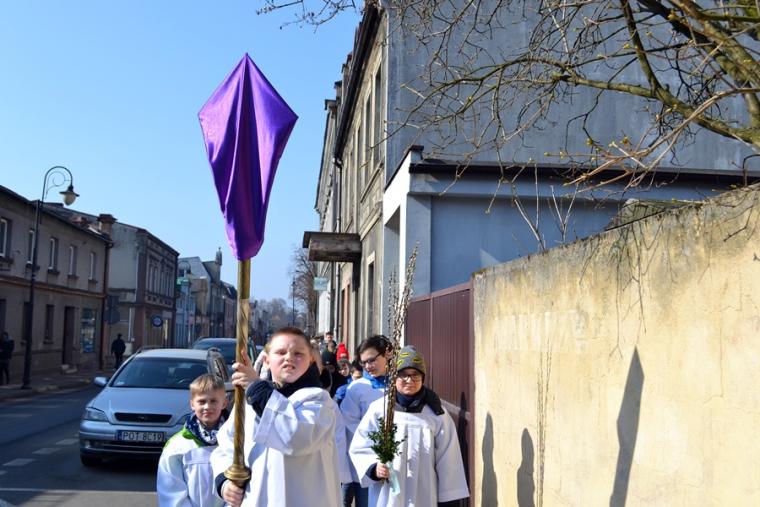 Młodsi zebrali się o godz. 10:50 przy figurze Serca Jezusowego na Rynku. Tu ks. wikariusz Krzysztof odczytał fragment Ewangelii opisujący wjazd Jezusa do Jerozolimy, następnie odmówił modlitwę i pobłogosławił przyniesione przez wiernych, głównie dzieci palmy. Po pobłogosławieniu palm zebrani na rynku udali się procesjonalnie do kościoła, gdzie ks. wikariusz Krzysztof Lipiński wraz z ks. kan. Grzegorzem Klapą sprawowali Eucharystię. W słowie skierowanym do zebranych w mikstackim wieczerniku ks. wikariusz podkreślił znaczenia dla wierzących nadchodzących dni Triduum Paschalnego. Zachęcał do uczestnictwa w nim zarówno dorosłych, jak i dzieci. W słowach skierowanych do rodziców zwrócił uwagę, że to na nich spoczywa obowiązek wyjaśnienia dzieciom znaczenia Triduum Paschalnego. Podkreślił, że najlepiej można to uczynić biorąc wspólnie w nim udział. Trudno jest wyjaśnić, opowiedzieć – jak powiedział jego istotę.