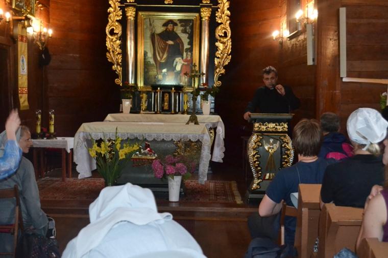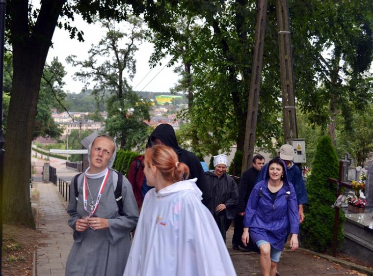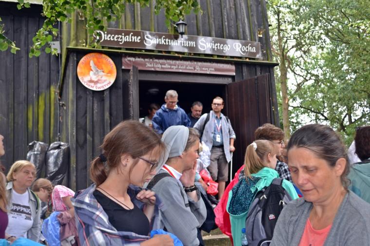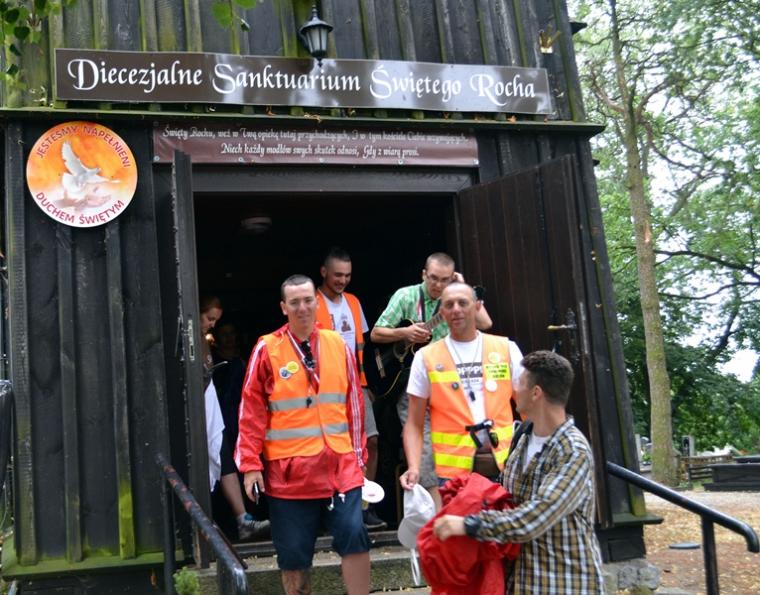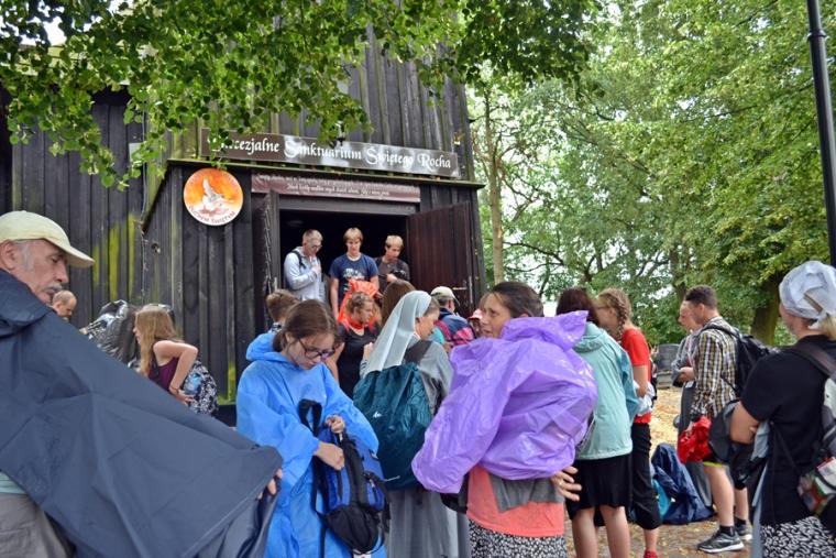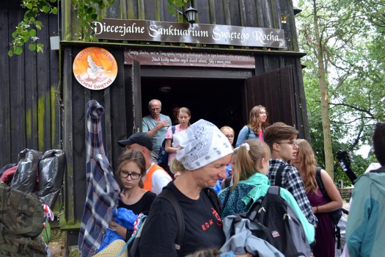 Wiele grup przeszło w ten lipcowy deszczowy dzień przez mikstacką parafię. Jak wspomniano, grupa 8 od lat przyjmowana jest na nocleg przez mieszkańców Mikstatu. Pątnicy z grupy 8 spotkali się o godz. 19:00 w kościele farnym pw. Świętej Trójcy na adoracji Najświętszego Sakramentu. Prowadzący je kapłan w słowach rozważania zwrócił uwagę na cztery etapy rozwoju wiary Piotra. Zachęcał jednocześnie zebranych w świątyni, by odpowiedzieli sobie na pytanie na jakim etapie jest ich wiara. Podczas adoracji była okazja do sakramentu pokuty i pojednania. Błogosławieństwo Najświętszym Sakramentem zakończyło modlitewną część spotkania. Z kolei grupa 9 nocowała w Komorowie. Od pięciu lat po drodze nawiedzają Diecezjalne Sanktuarium Świętego Rocha. Tu zostali powitani przez kustosza miejsca ks. kan. Krzysztofa Ordziniaka, który przybliżył im postać św. Rocha, akcentując rolę i znaczenie krzyża w Jego życiu. Podkreślił, że został on wymodlony rodziców przez wstawiennictwo Matki Bożej. Ks. kustosz zachęcał pątników, by „zaprzyjaźnili się” z tym Świętym, gdyż jest on patronem pielgrzymów. Wymowne było to spotkanie pielgrzymów ze Świętym Rochem. Przecież On też był pielgrzymem, więc doskonale rozumie ich ból, cierpienie, zmęczenie, ale jednocześnie może być dla nich wzorem wzajemnej służby, pomocy, głoszenie miłości Boga do człowieka właśnie na pielgrzymim szlaku. Następnie przy wystawionym Najświętszym Sakramencie pielgrzymi odśpiewali Koronkę do Miłosierdzia Bożego i wyruszyli w dalszą drogę do niedalekiego Komorowa, by tam nieco odpocząć. Rano obie grupy wyruszą na kolejny etap wędrówki… Taki jest pielgrzymi los. Jasna Góra coraz bliżej i już za pięć dni pątnicy staną przed tronem Matki i Królowej, by złożyć u Jej stóp swoje radości i troski, prośby i podziękowania.