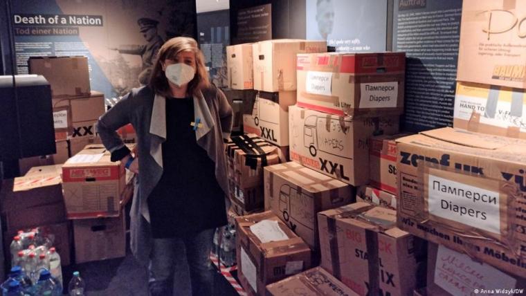 Szefowa Instytutu Pileckiego w Berlinie Hanna Radziejowska pośród kartonów z darami dla Ukrainy