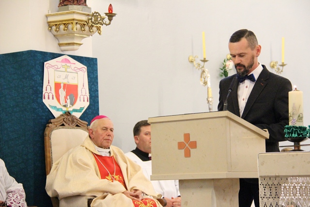 Relikwie bł. ks. Jerzego Popiełuszki zostały przyniesione w procesji z darami przez przedstawicieli rodziny zmarłego ks. prof. Antoniego Lewka.