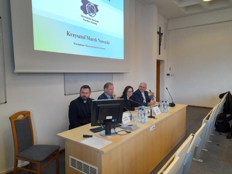 Zostało ono zorganizowane przez Katedrę Teologii Pastoralnej i Katechetyki we współpracy z Uniwersytetem Opolskim i Uniwersytetem Marii Curie-Skłodowskiej w Lublinie. Seminarium odbyło się w ramach projektu „Pedagogia tolerancji. Podążając za Karolem Wojtyłą”, realizowanego przy wsparciu Ministra Edukacji i Nauki w programie Społeczna Odpowiedzialność Nauki (nr projektu SONP/SP/461712/2020). Kierownikiem projektu jest ks. prof. dr hab. Zygfryd Glaeser z Wydziału Teologicznego Uniwersytetu Opolskiego, a wykonawcami w tym projekcie są: prof. dr hab. Anna Zellma z Wydziału Teologii UWM w Olsztynie i prof. dr hab. Jan Pomorski z Uniwersytetu Marii Curie-Skłodowskiej w Lublinie. Patronat honorowy objęli: Warmińsko-Mazurski Kurator Oświaty w Olsztynie, Komisja Wychowania Katolickiego Konferencji Episkopatu Polski i Stowarzyszenie Katechetyków Polskich. W seminarium udział wzięli liczni przedstawiciele grona pedagogicznego i środowiska akademickiego z całej Polski, w tym dyrektorzy szkół, nauczyciele, pedagodzy, katecheci, psycholodzy szkolni, dyrektorzy wydziałów katechetycznych, przedstawiciele mediów. Główną osią dyskusji była pedagogia tolerancji inspirowana nauczaniem Jana Pawła II, w której istotne miejsce zajmuje fundament aksjologiczny. W ramach seminarium poszukiwano odpowiedzi na pytania: czym jest właściwie rozumiana postawa tolerancji i jak ją praktykować na co dzień? Podjęto dialog z przedstawicielami różnych środowisk naukowych i wychowawczych (rodziny, szkoły, Kościoła, mediów) w celu wymiany doświadczeń w zakresie towarzyszenia młodym w kształtowaniu postawy tolerancji. Prelegenci i uczestnicy wspólnie debatowali nad tym, jakie są współczesne wyzwania w zakresie wychowania do tolerancji pozytywnej oraz co zrobić, aby wspólnie działać na rzecz promocji tolerancji inspirowanej nauczaniem Jana Pawła II. W pierwszym dniu odbyły się dwie sesje tematyczne. Pierwszą sesję moderował ks. dr hab. Andrzej Kielian (UPJPII). Tematyka koncentrowała się wokół tolerancji w rodzinie i szkole. Ks. dr hab. Dariusz Kurzydło, prof. UKSW interesująco przedstawił znaczenie rodziny w wychowaniu do tolerancji. Przypomniał, że rodzina jest pierwszą i znaczącą szkołą tolerancji. Szacunek do drugiego człowieka i do własnych korzeni, aktywne słuchanie siebie nawzajem, dzielenie się odpowiedzialnością, współdziałanie, akceptacja starości i przyjęcie nienarodzonego życia odgrywają ważną rolę w kształtowaniu postawy tolerancji pozytywnej w rodzinie. Przyczyniają się do budowania „nowej kultury życia” (EV 22). Ks. dr Łukasz Simiński (UMK, WSD w Pelplinie) wygłosił referat pt. Tolerancja w środowisku szkolnym a wykluczenie z powodów religijnych. Współczesna szkoła – jak trafnie zauważył – stawia wychowawców i wychowanków nie tylko wobec wyzwań w zakresie tolerancji religijnej, ale wobec szeroko rozumianego wykluczenia z powodów religijnych zarówno w gronie nauczycieli, jaki i uczniów. Rozważania teoretyczne ks. dr Ł. Simiński wzbogacił o interesujące odwołanie do wyników badań empirycznych, zarówno ilościowych, jak i jakościowych, w tym do studium przypadków. Wskazał na potrzebę otwartości na wychowanków, wczuwania się w ich środowisko, bycia z nimi, słuchania ich, prowadzenia dialogu, budowania relacji opartych na prawdzie i miłości oraz uczenia wrażliwości na odmienność drugiego człowieka. Do tematyki referatów bezpośrednio nawiązano w dyskusji, zwracając uwagę na nowe wyzwania w zakresie kształtowania postawy tolerancji pozytywnej. Krzysztof Marek Nowacki, Warmińsko-Mazurski Kurator Oświaty w Olsztynie, zabierając głos w dyskusji przypomniał, że „życie rodziców to jest książka podstawowa, którą czyta dziecko” (św. Augustyn). Wskazał na potrzebę pedagogizacji rodziców. Przypomniał o potrzebie oparcia tolerancji na fundamencie chrześcijańskich wartości i wyraźnego sprzeciwu wobec permisywizmu i polaryzacji społecznej. Zaznaczył też, że w kształtowaniu postawy tolerancji pozytywnej ważną rolę odgrywa samo spotkanie z drugim człowiekiem na różnych poziomach istnienia, szacunek drugiego człowieka i jego godności, otwartość, roztropność, wrażliwość społeczna, miłości do Boga, drugiego człowieka i ojczyzny. Uczestnicy dyskusji, reprezentujący różne środowiska wychowawcze i naukowe, dzielili się też osobistym doświadczeniem, zwracając uwagę na brak pogłębionej refleksji nad znaczeniem słowa „tolerancja”, utopijną wizję miłości i szacunku wobec każdego człowieka, każdego jego zachowania, postawy, poglądów i przekonań. Za kluczowe uznali stwarzanie dzieciom i młodzieży możliwości w zakresie prowadzenia dialogu, umiejętność empatycznego słuchania oraz okazywania wzajemnego szacunku i obdarowania się dobrem. Współczesny wychowawca ma być człowiekiem otwartym, odpowiedzialnym, zdolnym do obrony wartości i sprzeciwu wobec zła.