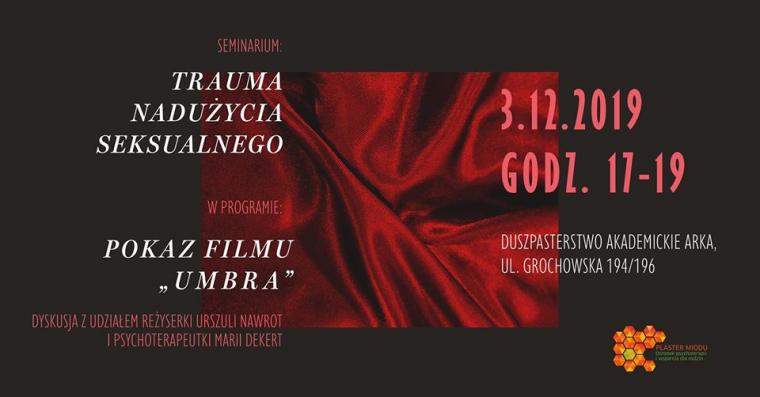 Na pokaz filmu „Umbra” w reżyserii Urszuli Nawrot oraz panel dyskusyjny z reżyserką oraz z psychoterapeutką Marią Dekert. zaprasza Ośrodek Plaster Miodu, „Fundacja Światło-Życie” Ośrodek w Warszawie oraz Duszpasterstwo Akademickie ARKA. Seminarium "Trauma nadużycia seksualnego" rozpocznie się we wtorek 3 grudnia br. o godz. 17.00 w domu akademickim przy ul. Grochowskej 194/196. Wstęp na wydarzenie jest wolny, ale z racji na ograniczoną ilość miejsc, obowiązują wcześniejsze zapisy: osrodek@plastermiodu.waw.pl lub przez formularz kontaktowy https://plastermiodu.waw.pl/kontakt/