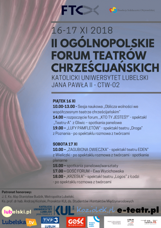 "Kto Ty jesteś?... - o patriotyzmie w obrazkach" to autorskie przedstawienie Teatru A przygotowane z myślą o dzieciach (i ich rodzinach), propozycja wspólnego teatralnego świętowania 100 rocznicy odzyskania niepodległości. Postawione w tytule pytanie „kto Ty jesteś?” odsyła oczywiście do wiersza Władysław Bełzy Katechizm polskiego dziecka, prowokuje podróż w rytmie stawianych w wierszu pytań - to one stały się inspiracją dla kolejnych „obrazków”. Rodzinne świętowanie z Teatrem A to przede wszystkim okazja do dobrej zabawy, chociaż uczciwość wobec polskiej historii zobowiązuje twórców do szukania sposobu, by mówić również o tych trudnych tematach. Co w przedstawieniu? Historia sensacyjna – dopytując o tożsamość pewnej starszej Pani: o losach ziemniaka na ziemiach polskich, splecionych z losami Odsieczy Wiedeńskiej, o orle bieliku, który „nie bardzo z rodziny orłów”, o bieli polskiej flagi, nasiąkającej szkarłatem krwi, lekkie wprawki geograficzne – nad rozsypaną mapą Polski, wreszcie o chocholim tańcu, z którego budzi nas dzwonek w sercu... bo tam, jak chciał Poeta, chroni się Ojczyzna... zatem – o patriotyzmie „w krwi obiegu”, który budzi dziecięcą radość, dumę, troskę i odpowiedzialność... za rzeczy małe – za rzeczy ważne...