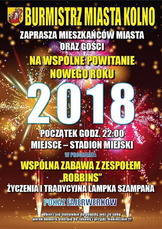 O godz.22.00 na stadionie miejskim w Kolnie (woj.podlaskim) rozpocznie się zabawa sylwestrowa wraz z zespołem Robbins. Uczestnicy będą mogli wysłuchać życzeń Burmistrza Miasta Kolno - pana Andrzeja Dudy.