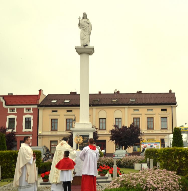 Rynek jest miejscem szczególnym dla naszej wspólnoty.  Tu nasi przodkowie w 1936 roku postawili figurę Najświętszego Serca Pana Jezusa. Aktu poświęcenia pomnika dokonał 12 lipca 1936 roku ks. bp Dymek, a w czasie tej  uroczystości ówczesny burmistrz  miasta Franciszek Toboła odczytał akt poświęcenia się miasta Najświętszemu Sercu Pana Jezusa.