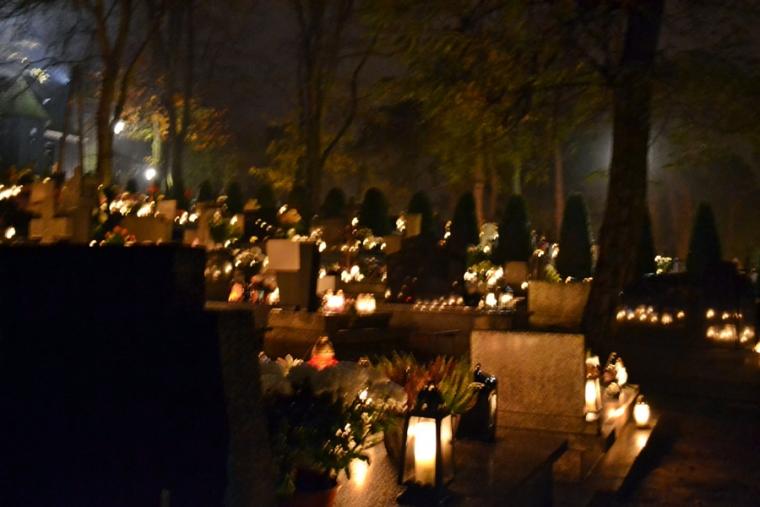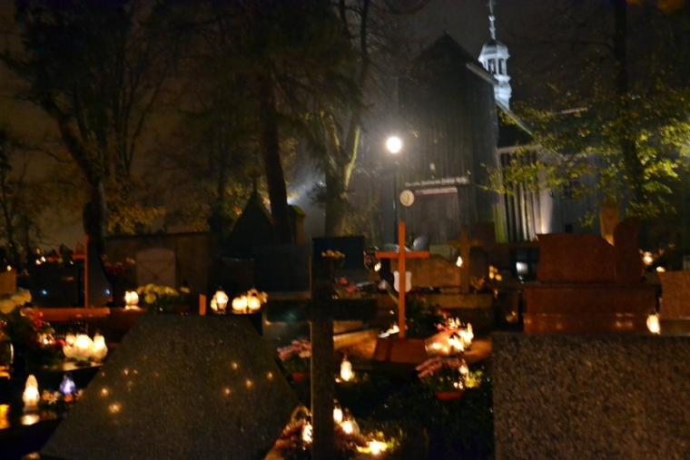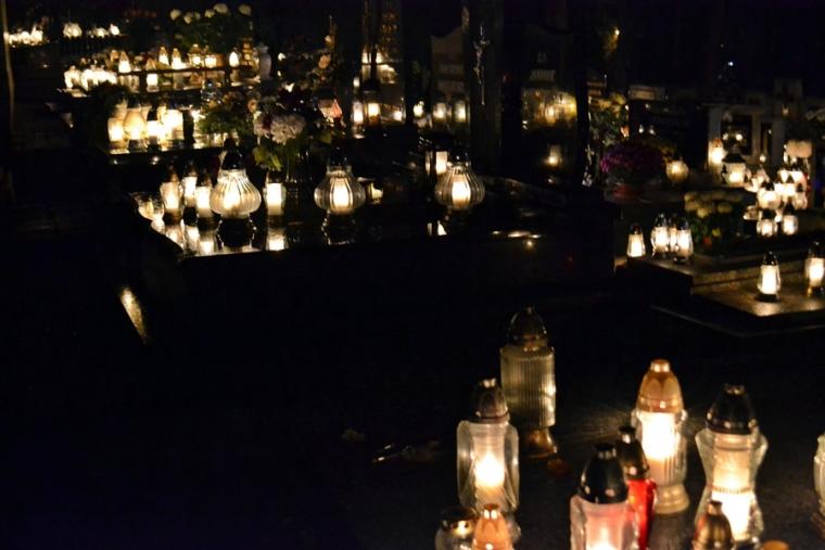 Głęboka w treści i zachęcająca do refleksji, ale i przemiany życia była ta przytoczona w rozważaniu legenda. Czy potrafimy odwiedzić, pocieszyć, dodać otuchy, być przy człowieku pogrążonym w smutku, płaczącym, biednym, głodnym, pragnącym sprawiedliwości. Czy potrafimy zdobyć się na zwykły ludzki gest? Być może to właśnie od tych zwykłych, pozornie nic nie znaczących gestów świadczących o miłości wobec bliźnich będzie zależało co usłyszymy od Boga, gdy przyjdzie nam zdać sprawę z naszego życia. Pan ofiarował nam czas, ale także przykład życia tak wielu świętych. Oni mogli osiągnąć świętość, możemy i my. Czy osiągniemy? Po Mszy Świętej alejkami wokół Sanktuarium wyruszyła procesja, podczas której przy pięciu stacjach modliliśmy się za zmarłych: kapłanów, biskupów, papieży, za rodziców, rodzeństwo, dziadków, krewnych, przyjaciół. Przy trzeciej stacji modlitwą objęliśmy zmarłych parafian, sąsiadów. Nie zabrakło także modlitwy w intencji tych, których miejsca wiecznego spoczynku nie znamy, a także za tych którzy zginęli obozach koncentracyjnych. Przy piątej stacji modliliśmy się za wszystkich zgromadzonych na cmentarzu prosząc dla nich o pragnienie osiągnięcia świętości. Modlitwą objęta została także ta osoba, którą jako pierwszą spośród zebranych Pan powoła do siebie. Nie wiemy kto to będzie, to wie tylko Bóg. Niewątpliwie modlitwa przy tej stacji stanowiła okazję do tego, by zadać sobie pytanie- czy jestem przygotowany ( przygotowana) na spotkanie z Panem. Uroczystość uświetniła orkiestra parafialna. O godz. 19:00 w sanktuarium spotkaliśmy się na modlitwie różańcowej połączonej z wypominkami. Mimo padającego deszczu jeszcze w późnych godzinach wieczornych wielu przemierzało cmentarne alejki, zatrzymując się przy grobach bliskich, przyjaciół, znajomych. Ofiarowana modlitwa, położone na grobach kwiaty, płonące lampki są dowodem na to, że o nich pamiętamy…
