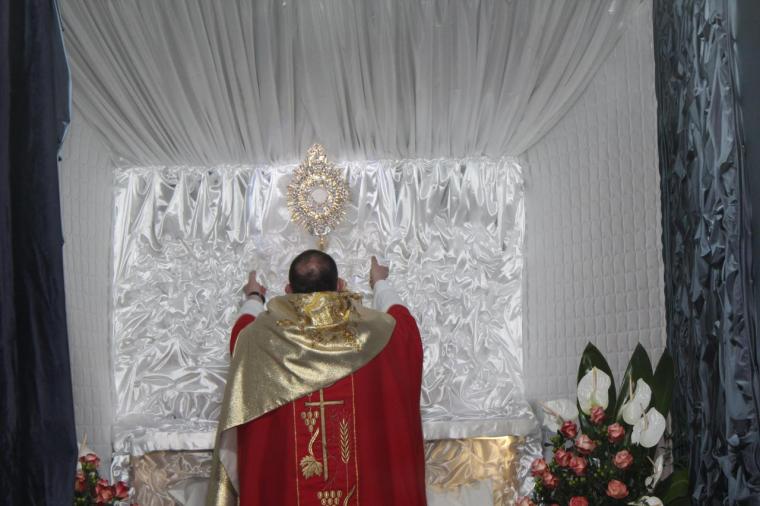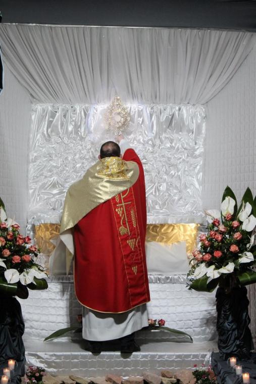 Procesja z Najświętszym Sakramentem w monstrancji okrytej białym przejrzystym welonem ~ symbolem całunu turyńskiego, w który owinięto ciało zmarłego Chrystusa, do Grobu Pańskiego zakończyła wielkopiątkową Liturgię Męki Pańskiej.