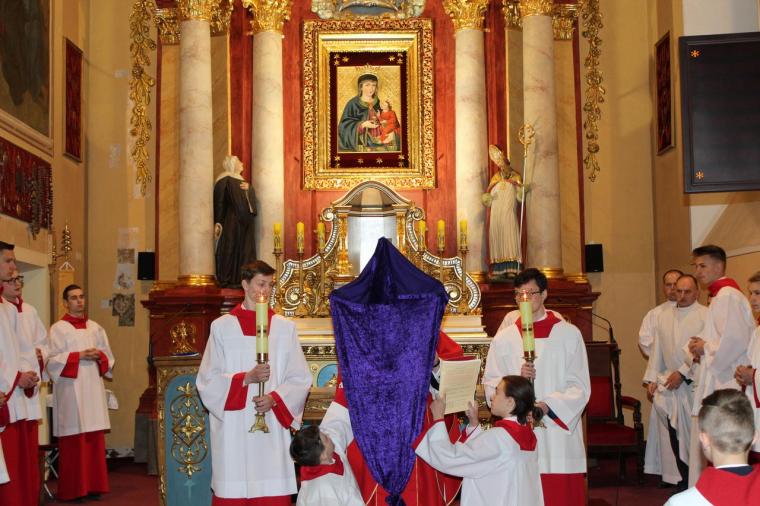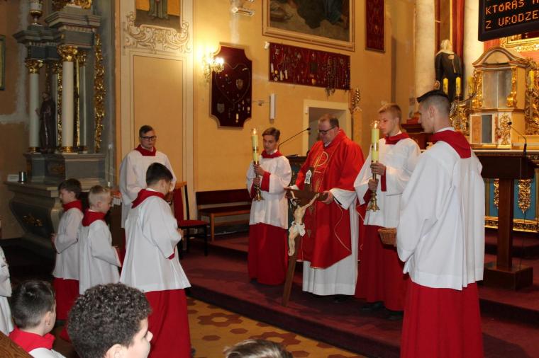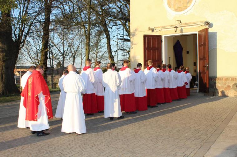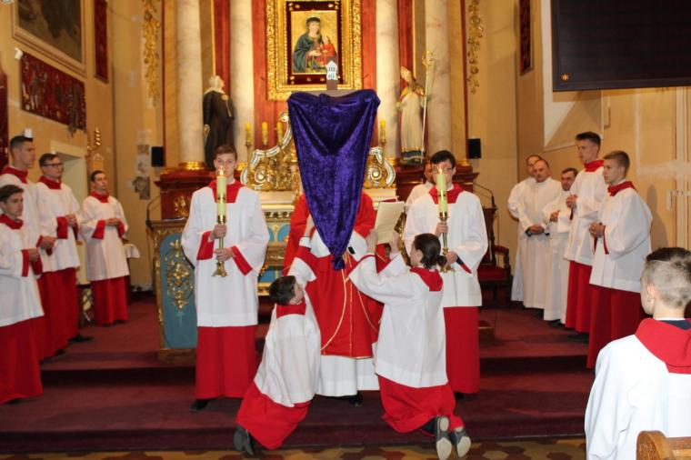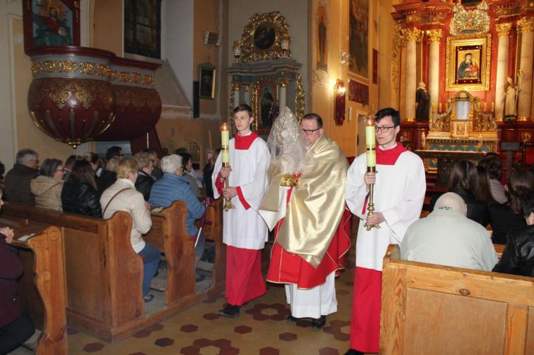 Niepowtarzalna wielkopiątkowa Liturgia Męki Pańskiej została odprawiona przez kustosza Sanktuarium, ks. kan. Łukasza Żurawskiego o godzinie 19:00. Rozpoczęła się ona od wejścia celebransa i asysty w ciszy do kościoła, którzy przed ołtarzem przez chwilę leżeli krzyżem. Po modlitwie wstępnej odczytane zostało proroctwo o Cierpiącym Słudze Jahwe i fragment Listu do Hebrajczyków. Następnie odczytany został, z podziałem na role, opis Męki Pańskiej według św. Jana.