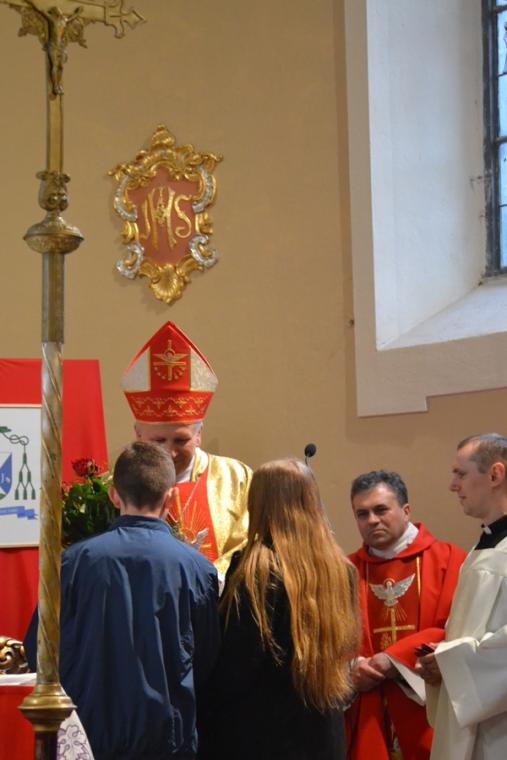 Po wyznanie wiary i modlitwie ks. bpa i obecnych kapłanów  o dary Ducha Świętego dla przyjmujących Sakrament Bierzmowania miało miejsce namaszczenie  czoła olejem Krzyżma Świętego, któremu towarzyszą słowa formuły sakramentalnej: „Przyjmij znamię daru Ducha Świętego”.