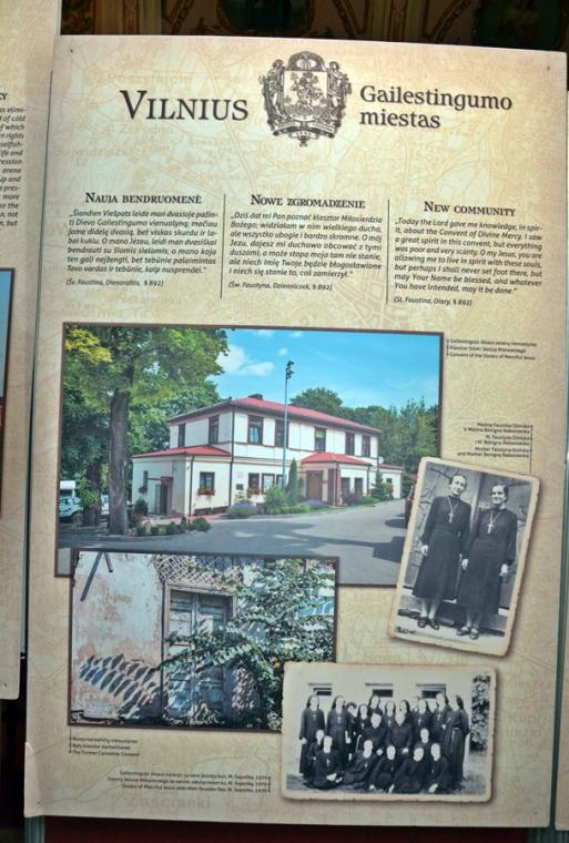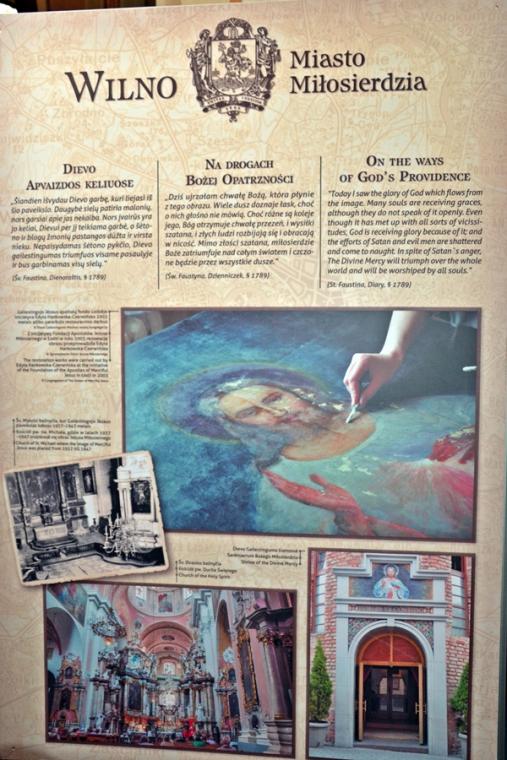 Ponadto w lipcu organizowana jest z parafii pielgrzymka do Wilna. Wystawa ma więc zachęcić do wyruszenia na pielgrzymi szlak, a tym którym nie będzie to dane przybliżyć miejsca związane z kultem Bożego miłosierdzia. Jest ich jak możemy się przekonać oglądając wystawę bardzo wiele. Pomysłodawcą wystawy jest ks. Mariusz Marszałek, były sekretarz ks. Abp Wilna Gintarasa Grusasa. Po raz pierwszy została zaprezentowana w Senacie w 2016 roku. Autorem zdjęć jest artysta i fotograf Marian Dzwinel. Wystawa składa się z 16 plansz, na których umieszczone są zdjęcia i teksty w trzech językach polskim, litewskim, i angielskim. Oto niektóre tytuły prezentowanych na wystawie plansz: Apostołka Bożego Miłosierdzia, Święta Faustyna w Wilnie, Matka Miłosierdzia, Nadzieja, Dzieła Miłosierdzia, Na drogach Bożej Opatrzności, Obraz Jezusa Miłosiernego, Nowe zgromadzenia, Krzyż wyrazem Bożego miłosierdzia i kilka innych. Na jeszcze jedną chcemy zwrócić uwagę – Nowa iskra, a na niej Sanktuarium Miłosierdzia Bożego i tekst Aktu zawierzenia losu świata Miłosierdziu Bożemu przez św. Jana Pawła II. Dodajmy, że każda plansza zawiera opis miejsca, bądź fragment z Dzienniczka św. S. Faustyny, czy pamiętnika, listów bł. Michała Sopoćko.