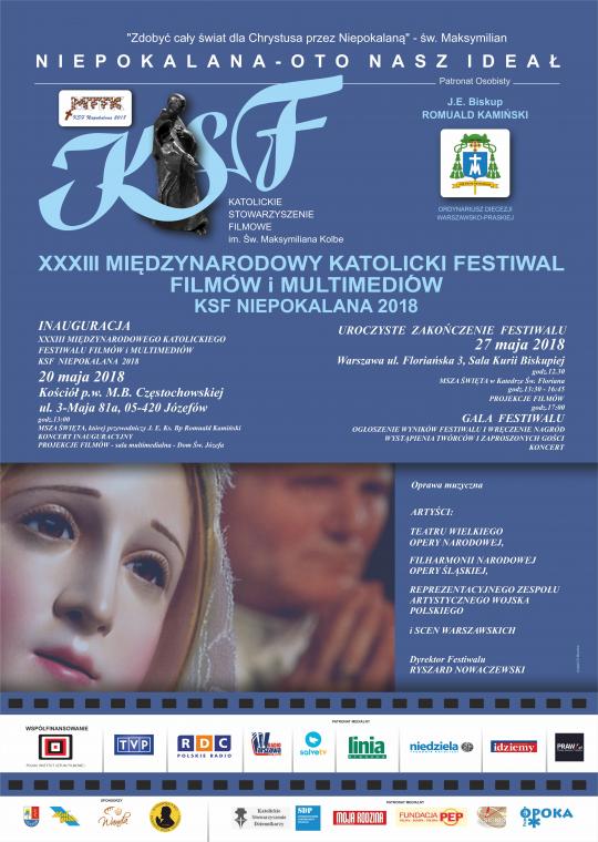 XXXIII Międzynarodowy Katolicki Festiwal Filmów i Multimediów "KSF Niepokalana 2018" http://www.ksfniepokalana.pl rozpoczął się w niedzielę 20 maja 2018 Mszą św. celebrowaną przez bpa Romualda Kamińskiego, Ordynariusza Diecezji
