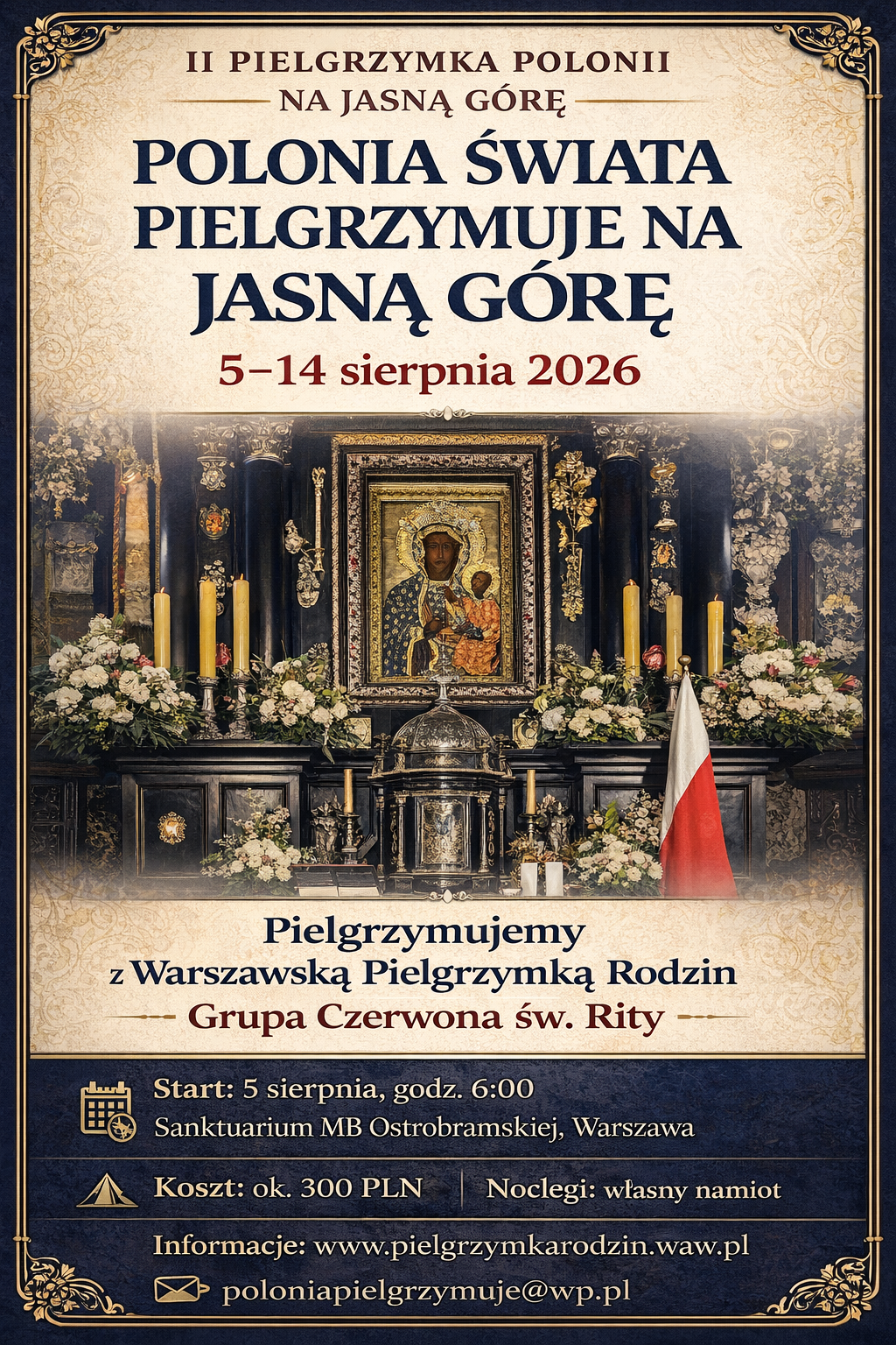 Wędrować będziemy wraz z Pieszą Pielgrzymką Rodzin Diecezji Warszawsko-Praskiej, jako podgrupa Czerwonej Grupy św. Rity. Duchowość tej świętej będzie nam szczególnie towarzyszyć podczas drogi – w pielgrzymce niesione są również relikwie św. Rity. Naszym pragnieniem jest, aby w przyszłości powstała niezależna Biało-Czerwona grupa Polonii.